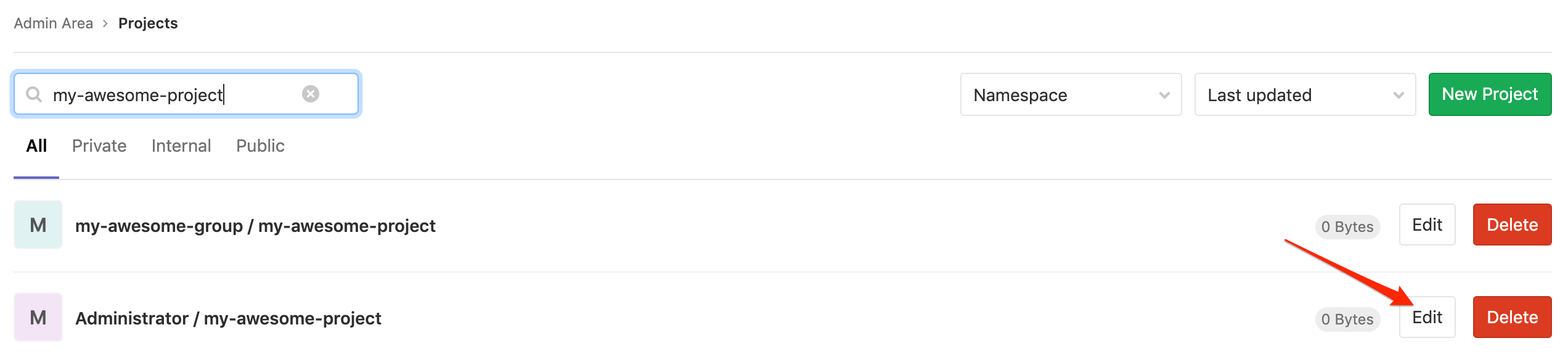 Navigate to the Admin Area > Projects dashboard on the primary node, find the project that you want to check the checksum differences and click on the Edit button: