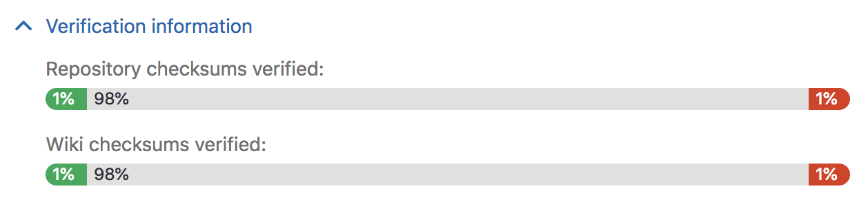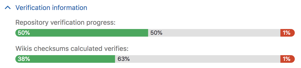 Navigate to the Admin Area > Geo dashboard on the primary node and expand the Verification information tab for that node to view automatic checksumming status for repositories and wikis. Successes are shown in green, pending work in grey, and failures in red.