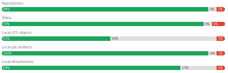 Navigate to the Admin Area > Geo dashboard on the secondary node to review status. Replicated objects (shown in green) should be close to 100%, and there should be no failures (shown in red). If a large proportion of objects aren't yet replicated (shown in grey), consider giving the node more time to complete