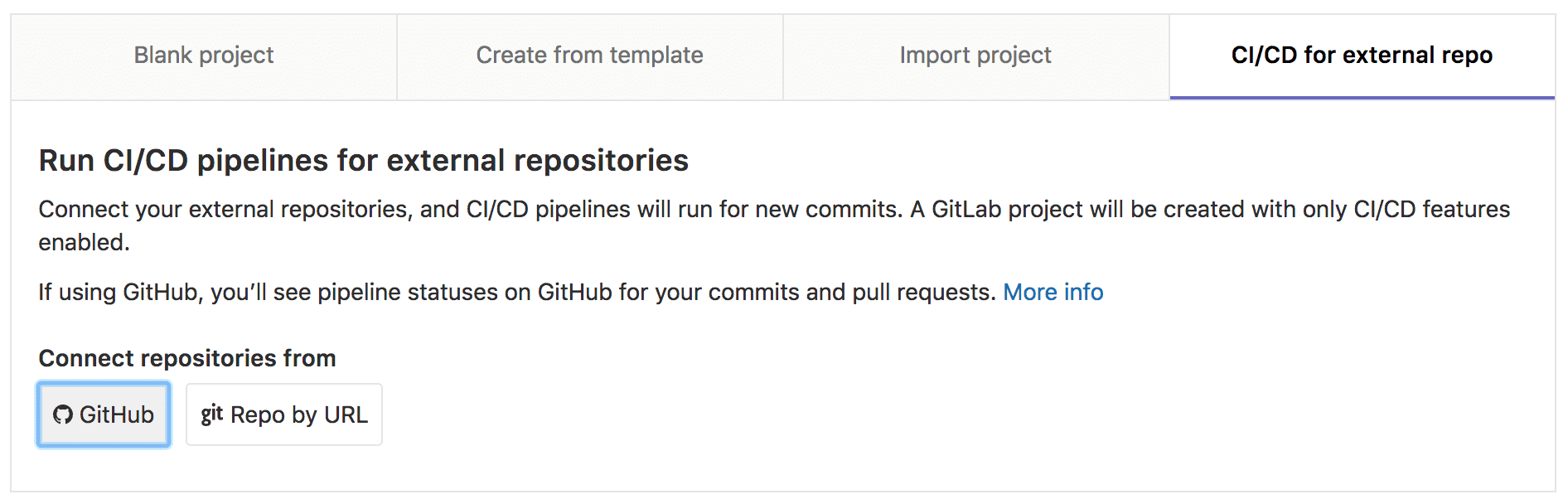 In GitLab create a CI/CD project using the Git URL option and the HTTPS URL for your GitHub repository. If your project is private, use the personal access token you just created for authentication.
