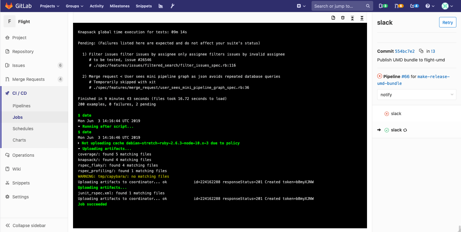 Pipeline mini graphs allow you to see all related jobs for a single commit and the net result of each stage of your pipeline. This allows you to quickly see what failed and fix it.