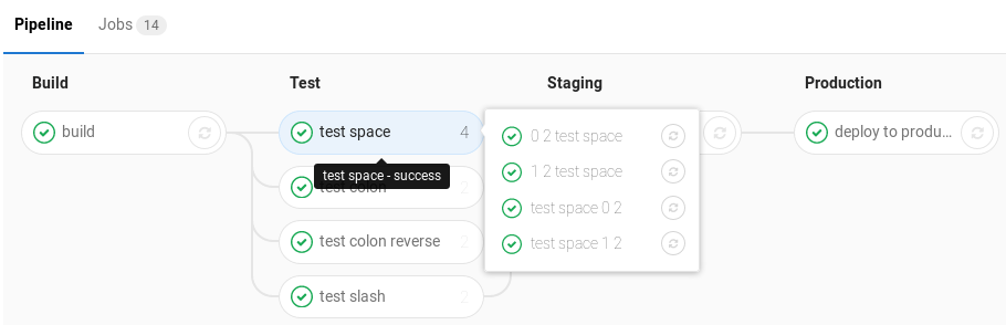 For that reason, similar jobs can automatically be grouped together. If the job names are formatted in certain ways, they will be collapsed into a single group in regular pipeline graphs (not the mini graphs).