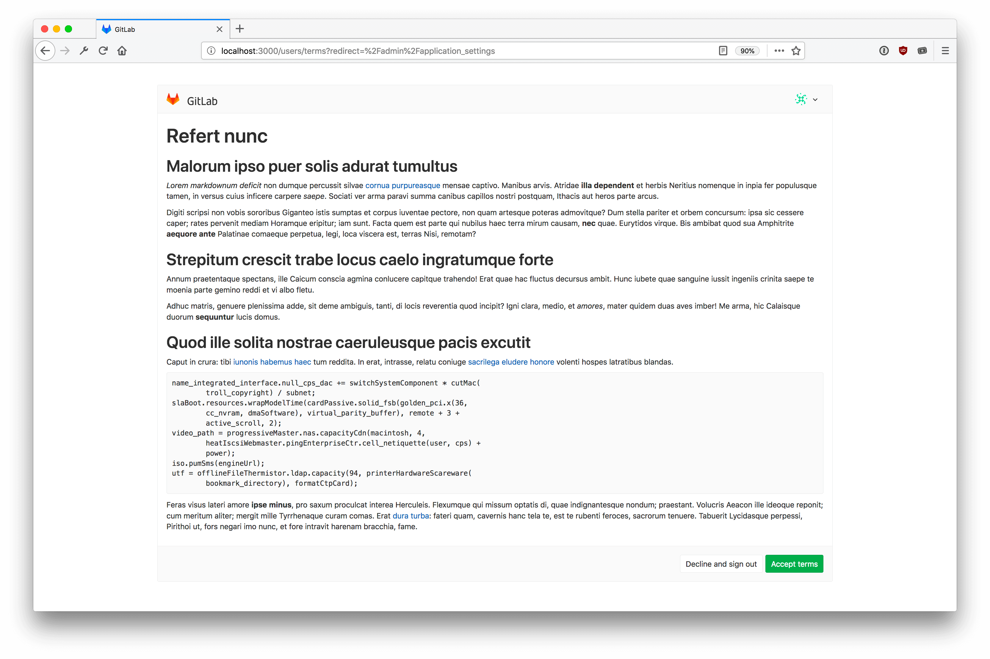 For each update to the terms, a new version is stored. When a user accepts or declines the terms, GitLab will record which version they accepted or declined.