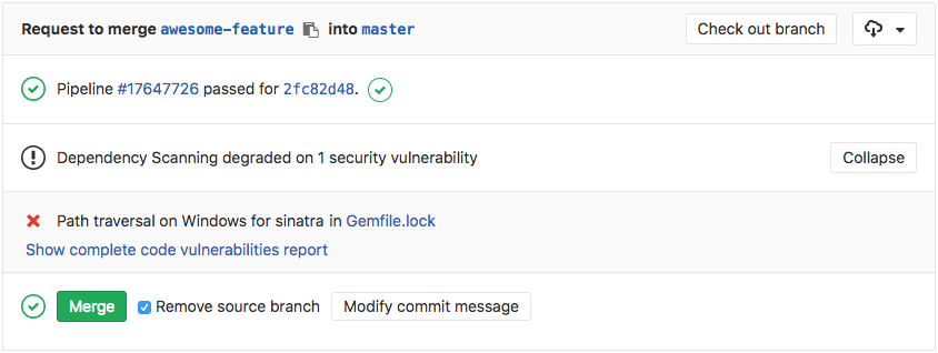 GitLab checks the Dependency Scanning report, compares the found vulnerabilities between the source and target branches, and shows the information right on the merge request.
