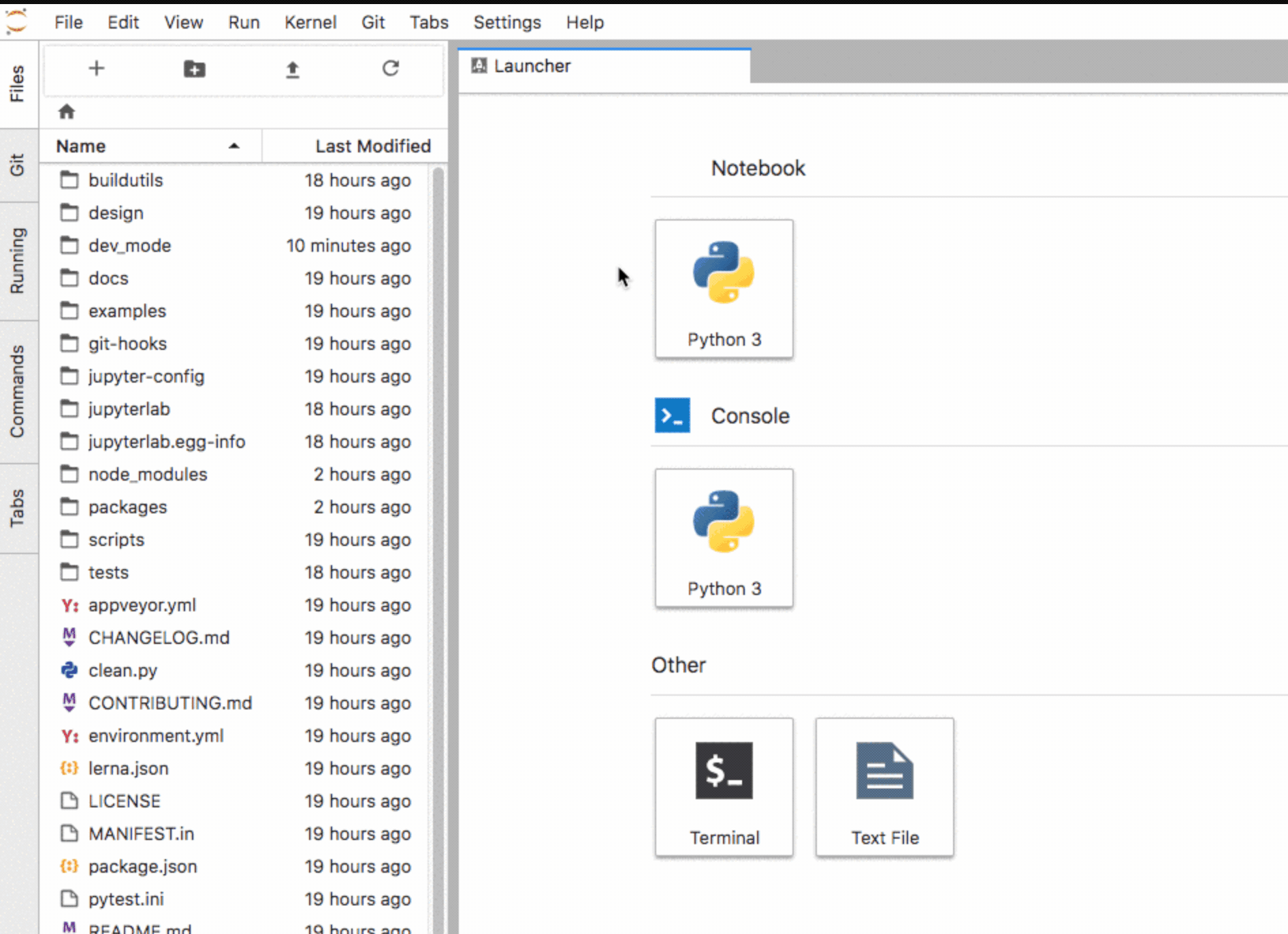 JupyterLab's Git extension enables full version control of your notebooks as well as issuance of Git commands within Jupyter. Git commands can be issued via the Git tab on the left panel or via Jupyter's command line prompt.