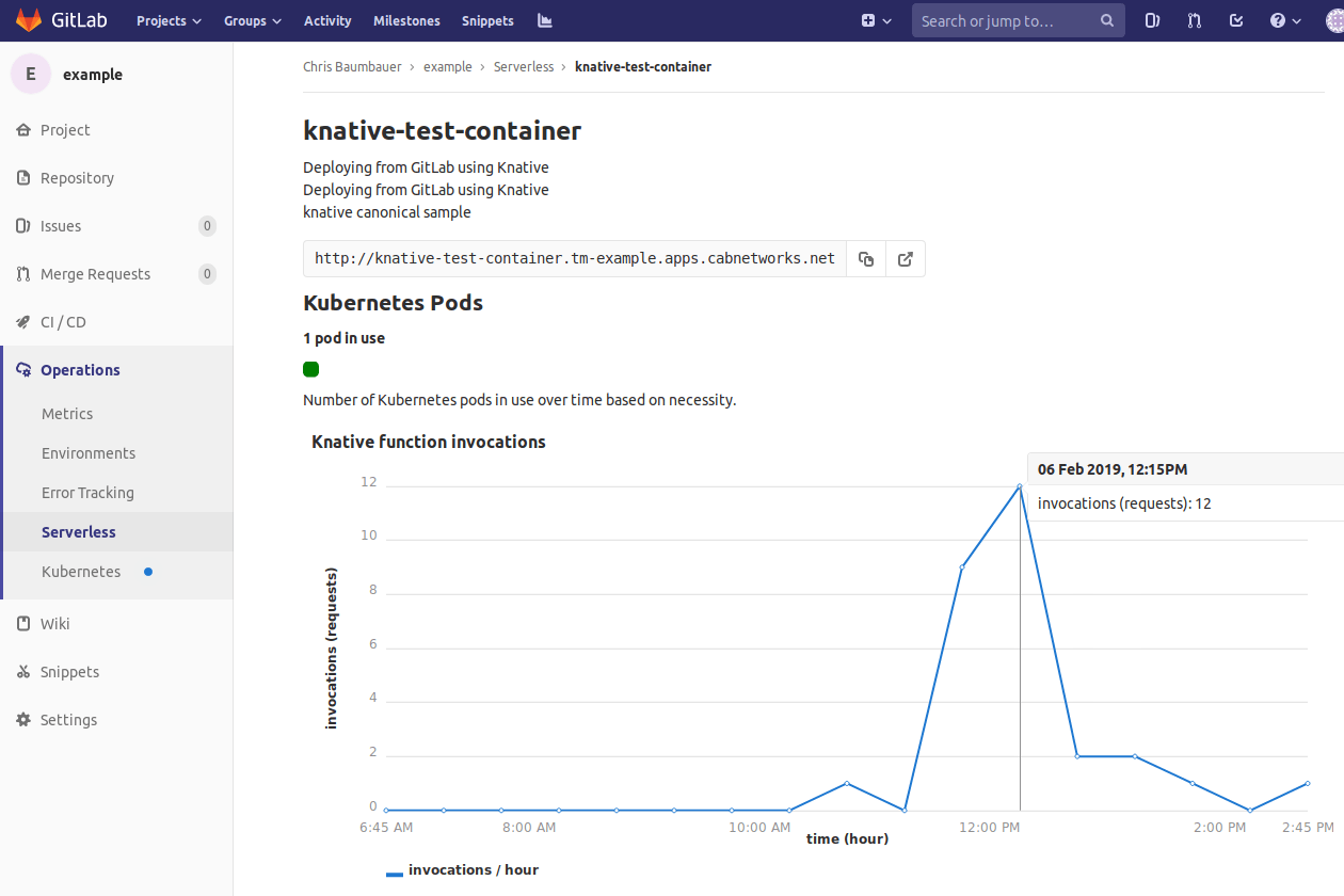 <namespace>is the namespace created by GitLab for your serverless project (composed of<project_name>-<project_id>-<environment>) andexample.comis the domain being used for your project. If you are unsure what the namespace of your project is, navigate to the Operations > Serverless page of your project and inspect the endpoint provided for your function/app.In the above image, the namespace for the project is