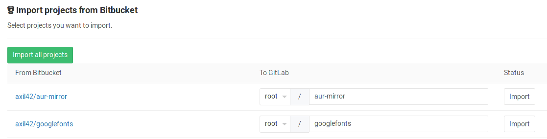 5. Click on the projects that you'd like to import or Import all projects. You can also select the namespace under which each project will be imported.