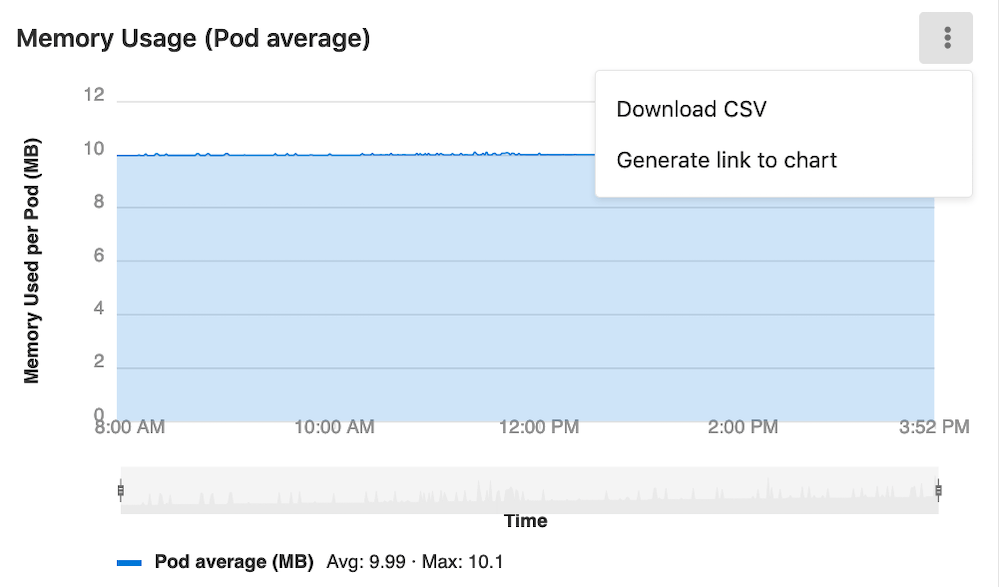 Data from Prometheus charts on the metrics dashboard can be downloaded as CSV.