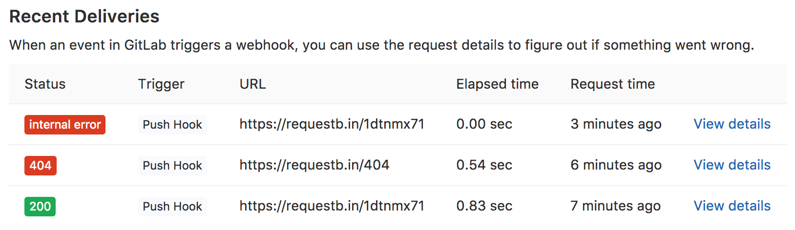 On this page, you can see data that GitLab sends (request headers and body) and data that it received (response headers and body).