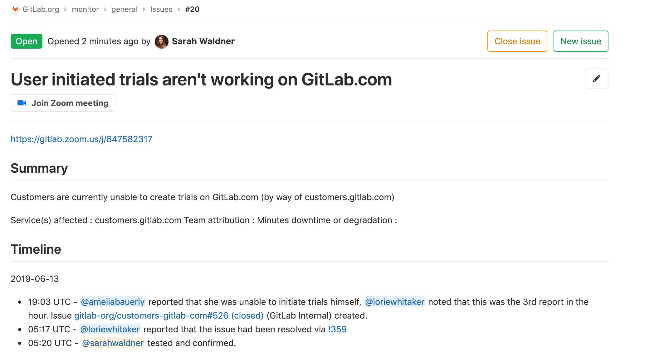 The image below illustrates what an issue may look like. Note that certain parts will look slightly different or will be absent, depending on the version of GitLab being used and the permissions of the user viewing the issue.