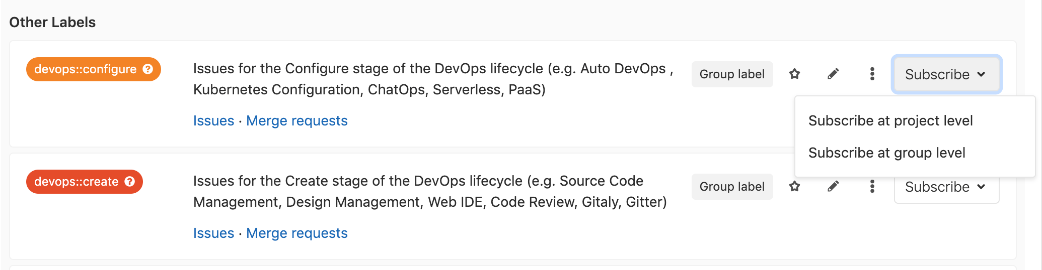 - Group labels can be assigned to any issue or merge request in any project in that group, or any subgroups of the group.