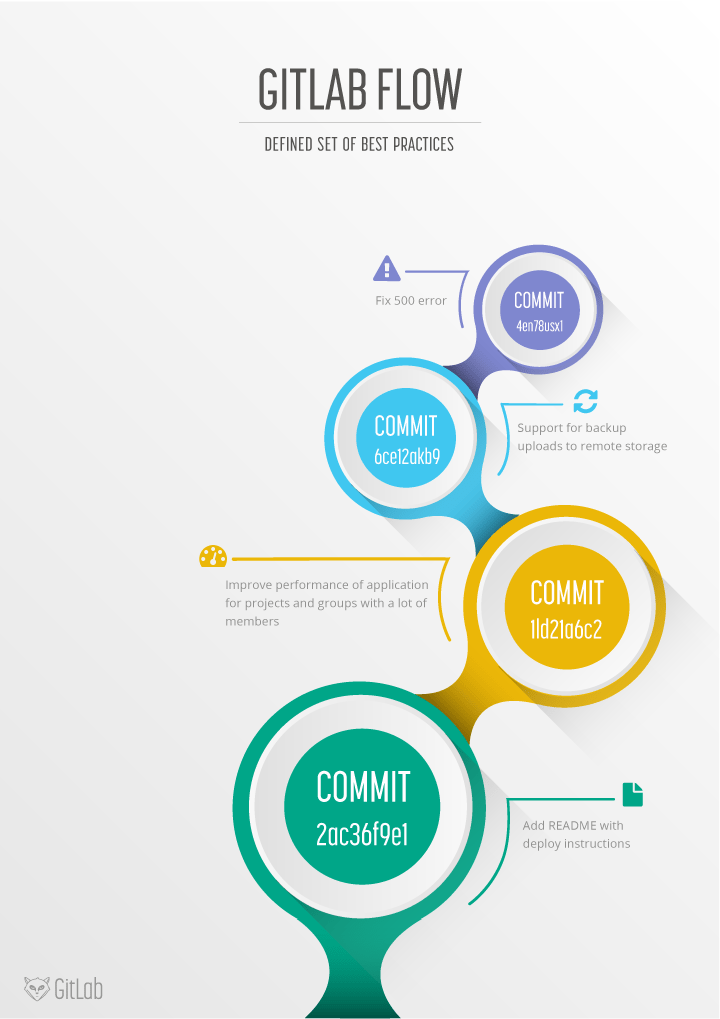 Git allows a wide variety of branching strategies and workflows. Because of this, many organizations end up with workflows that are too complicated, not clearly defined, or not integrated with issue tracking systems. Therefore, we propose GitLab flow as a clearly defined set of best practices. It combines feature-driven development and feature branches with issue tracking.