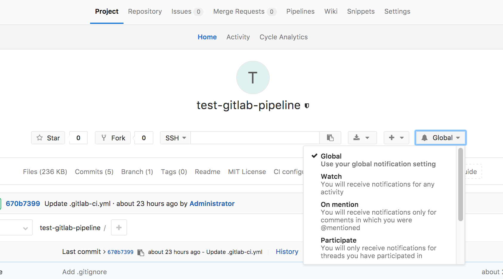 - Global: For groups and projects, notifications as per global settings.